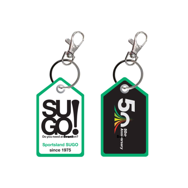 白地に映える『SUGO!』ロゴと、黒字に輝く『50周年』記念ロゴ。それぞれ異なる雰囲気を持つ2つのデザインが、ひとつのタグに詰まっています。爽やかさと重厚感、両方の魅力を楽しめる贅沢な仕上がりです。ナスカン付きで、バッグや鍵、ポーチなど、日常のアイテムにスマートに取り付け可能。さりげなく個性を演出できるアクセサリーです。